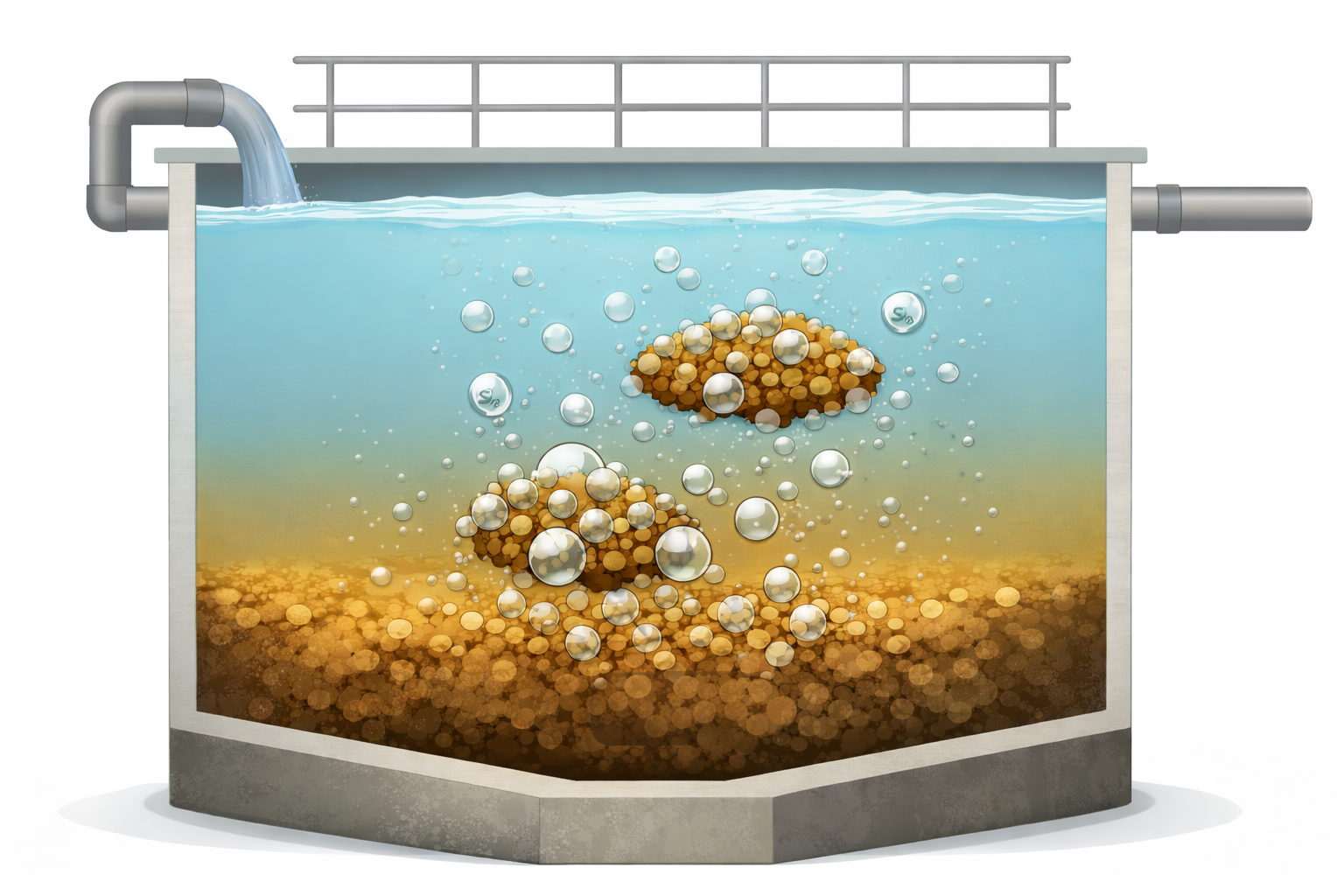 침전조는 원래 고형물의 침강을 목적으로 하지만, 체류시간이 길어지거나 유입수의 DO(용존산소)가 낮은 경우 침전조 내부가 무산소(Anoxic) 상태가 되기 쉽다.